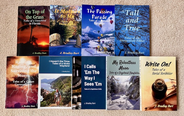 I have also published ten collections of tales, including: On Top of the Grass: Tales of a Snowbird in Florida, 2008; It Matters to Me: Tales of a Young Father, 2010; The Passing Parade: Tales of a Bemused Bystander, 2017; Tall and True: Tales of an Unrepentant Fibber, 2019; Ranting, Raging, and Surviving the Storm: Tales of a Closet Curmudgeon, 2019; I Haven’t the Time: Tales of a Woke Wayfarer, 2020; I Calls ‘Em The Way I Sees ‘Em: Tales of a Capricious Critic, 2020; My Relentless Muse: Tales of A Vagabond Storyteller, 2023; and Write On! Tales of a Serial Scribbler.