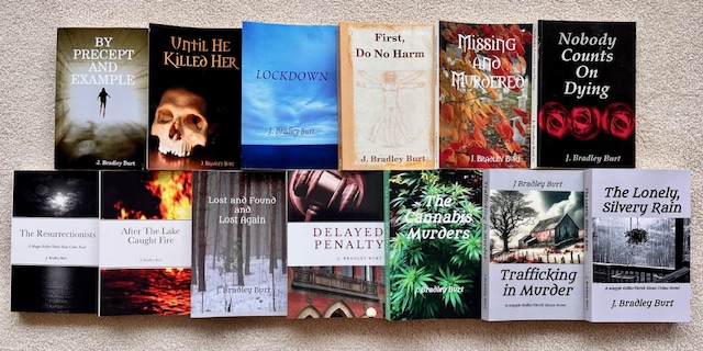 Over the years, I have published fourteen novels in my Maggie Keiller/Derek Sloan crime-fiction series. The previous thirteen are: By Precept and Example, 2007; Until He Killed Her, 2010; Lockdown, 2012; First, Do No Harm, 2015; Missing and Murdered, 2017; Nobody Counts On Dying, 2019; The Resurrectionists, 2020; After the Lake Caught Fire, 2021; Lost and Found and Lost Again, 2022, Delayed Penalty, 2023; The Cannabis Murders, 2024; Trafficking In Murder, 2024; and The Lonely, Silvery Rain, 2025.